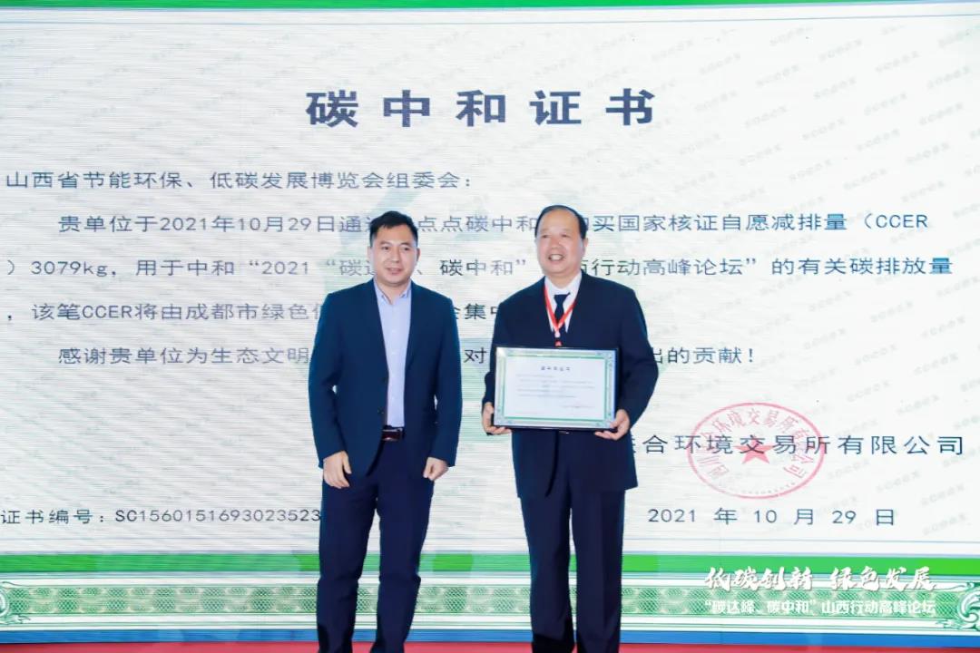 經(jīng)相關(guān)方面核算,預(yù)估本次論壇的總排放量為3.079噸二氧化碳當(dāng)量。根據(jù)本次論壇的排放情況,將本次會(huì)議執(zhí)行過程中產(chǎn)生的二氧化碳排放量,通過購(gòu)買 CCER實(shí)現(xiàn)了碳減排的抵消。在現(xiàn)場(chǎng),祥睿能源授予大會(huì)組委會(huì)《碳中和證書》,由省節(jié)能協(xié)會(huì)會(huì)長(zhǎng)藺建國(guó)代表組委會(huì)領(lǐng)取了該項(xiàng)證書。