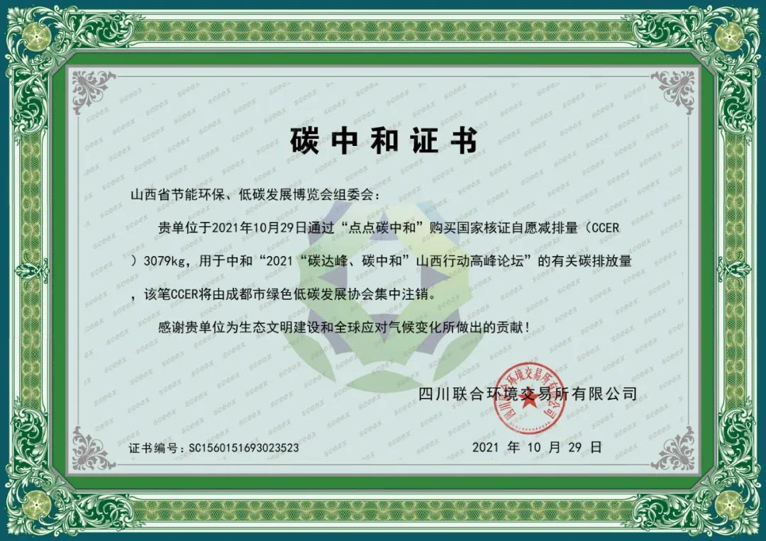 祥睿能源作為會議協(xié)辦單位,結(jié)合會議“低碳創(chuàng)新·綠色發(fā)展”的主題,聯(lián)合主辦方打造成了名副其實的山西首次碳中和博覽會,即將本次會議執(zhí)行過程中產(chǎn)生的二氧化碳排放量,通過購買 CCER實現(xiàn)了碳減排的抵消。同時,在現(xiàn)場授予了大會組委會《碳中和證書》,由省節(jié)能協(xié)會會長藺建國代表組委會領(lǐng)取了該項證書。