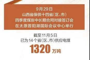 山西作為全國的產(chǎn)煤主要省份,積極貫徹落實(shí)黨中央、國務(wù)院關(guān)于做好煤炭保供穩(wěn)價工作、確保群眾溫暖過冬的決策部署,發(fā)揮能源大省的使命擔(dān)當(dāng),站在講貢獻(xiàn)、講大局、講落實(shí)的高度,在基本滿足本省民生用煤需求的基礎(chǔ)上,按照“雙控”要求限制高耗能企業(yè)用煤,把有限的能源不遺余力地貢獻(xiàn)出來,全力以赴為用煤緊張的省份提供適銷對路的優(yōu)質(zhì)煤炭,推動煤炭價格理性回歸,為保障國家能源安全和群眾溫暖過冬作出了積極貢獻(xiàn)。 推動煤炭增產(chǎn)增供 9月29日,“山西省保供十四?。▍^(qū)、市)四季度煤炭中長期合同對接簽訂會”在太原晉陽湖國際會議中心舉行。會上,山西與河北、山東、江蘇、浙江、天津等14個?。▍^(qū)、市)簽訂四季度煤炭中長期保供合同,保障能源供應(yīng)。截至11月5日,已為14個省(區(qū)、市)供應(yīng)電煤1320萬噸。