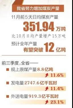 省能源局相關(guān)負(fù)責(zé)人表示,截至2021年10月底,我省已組織專家完成了39座核增產(chǎn)能煤礦的報(bào)告評審和現(xiàn)場核查,預(yù)計(jì)凈增產(chǎn)能4100萬噸/年。按照下半年每月煤炭產(chǎn)量1億噸以上的目標(biāo),我省指導(dǎo)全省煤炭企業(yè)在確保安全的前提下,加強(qiáng)生產(chǎn)調(diào)度,充分釋放煤炭產(chǎn)能,努力增加煤炭產(chǎn)量。11月前5天日均煤炭產(chǎn)量為351.94萬噸,比10月日均產(chǎn)量增產(chǎn)15萬噸,預(yù)計(jì)全年產(chǎn)量有望突破12億噸。