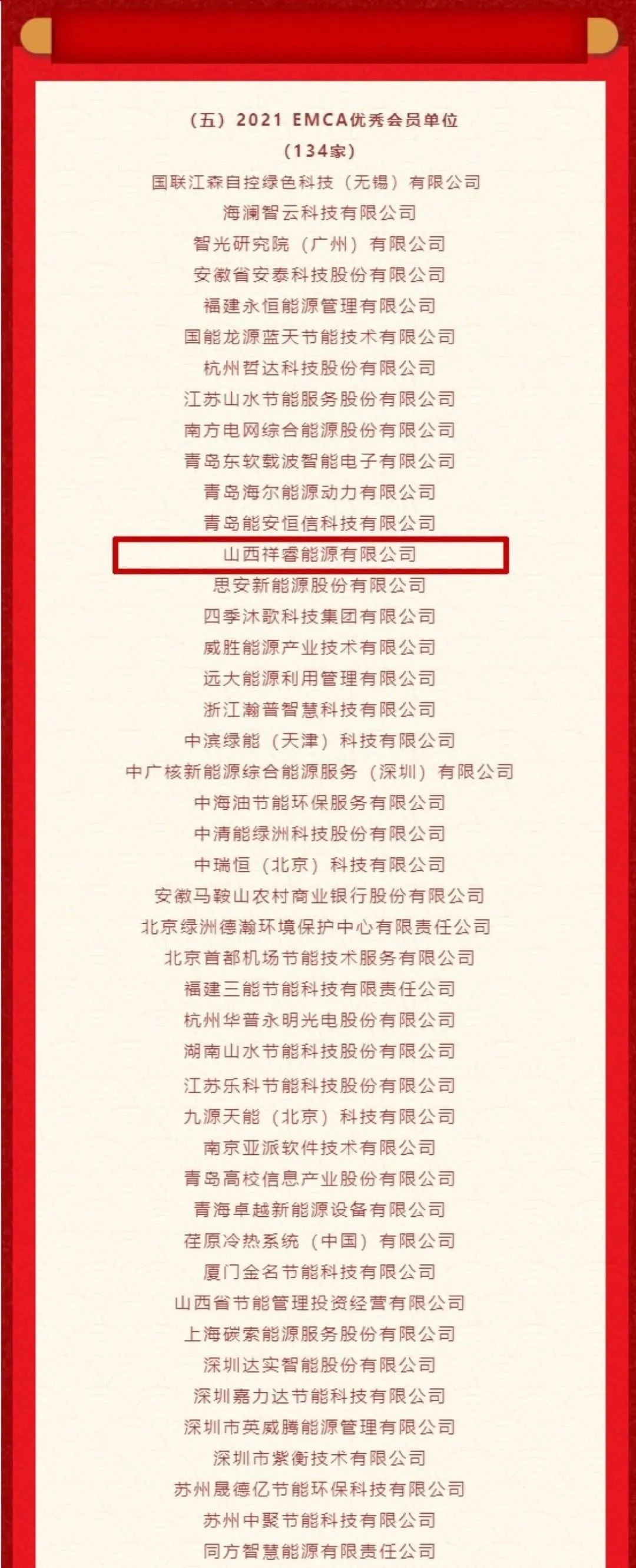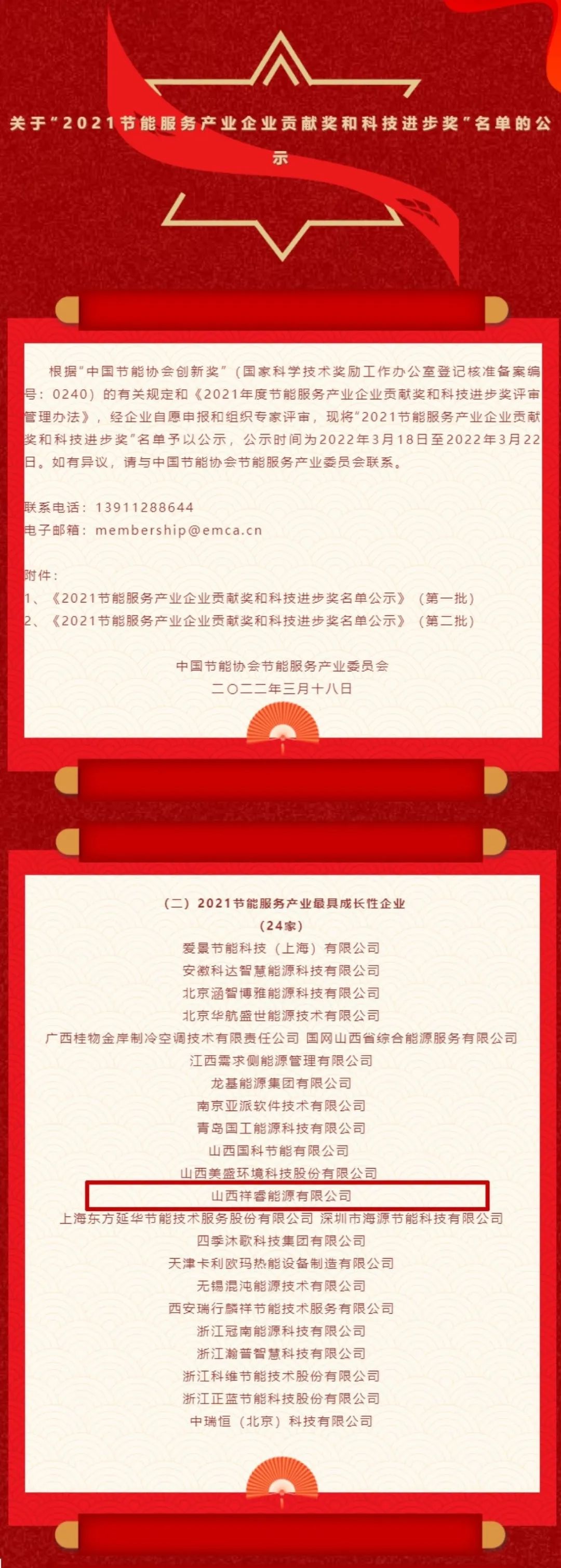 3月18日,中國(guó)節(jié)能協(xié)會(huì)節(jié)能服務(wù)產(chǎn)業(yè)委員會(huì)發(fā)布了關(guān)于《2021節(jié)能服務(wù)產(chǎn)業(yè)企業(yè)貢獻(xiàn)獎(jiǎng)和科技進(jìn)步獎(jiǎng)名單的公示》。山西祥睿能源有限公司榮登榜單,入選“2021年節(jié)能服務(wù)產(chǎn)業(yè)最具成長(zhǎng)性企業(yè)”和“2021EMCA優(yōu)秀會(huì)員單位”稱號(hào)。