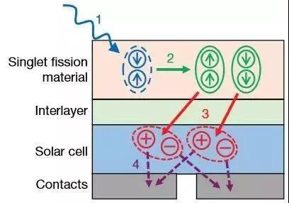 在太陽能電池中,光子激發(fā)材料分子釋放電子,產(chǎn)生電流。通常一個光子只能激發(fā)出一個電子,高能光子的剩余能量會以熱量的形式散失。 此前人們發(fā)現(xiàn),在并四苯等某些有機材料里,一個分子吸收一個高能光子后,可將部分能量轉(zhuǎn)移給另一個分子,最終產(chǎn)生兩個電子,這種現(xiàn)象稱為“單線態(tài)激子裂變”。理論上,在硅電池上覆蓋一層并四苯,就能用一個高能光子獲得兩個電子,但如何讓“單線態(tài)激子裂變”產(chǎn)生的兩個電子轉(zhuǎn)移到硅材料中是一個關(guān)鍵難題。 為了保證電池效率和耐久性,硅材料必須有表面鈍化層。并四苯中產(chǎn)生的電子必須穿過鈍化層,才能到達硅材料。相對于電子轉(zhuǎn)移能力來說,目前的鈍化層都太厚了。 新方案的關(guān)鍵是用氮氧化鉿對硅材料進行鈍化,得到的鈍化層厚度僅0.8納米(1納米等于十億分之一米),可容許更多電子通過。研究表明,并四苯每吸收一個光子,平均有1.3個電子可穿過氮氧化鉿鈍化層,轉(zhuǎn)移到硅材料里。研究人員說,新電池效率遠未達到理論極限,尚需改進,但試驗證明了其中的關(guān)鍵步驟行之有效。該方案沒有引入復雜的設計,而且可能使電池總體上更薄。 |