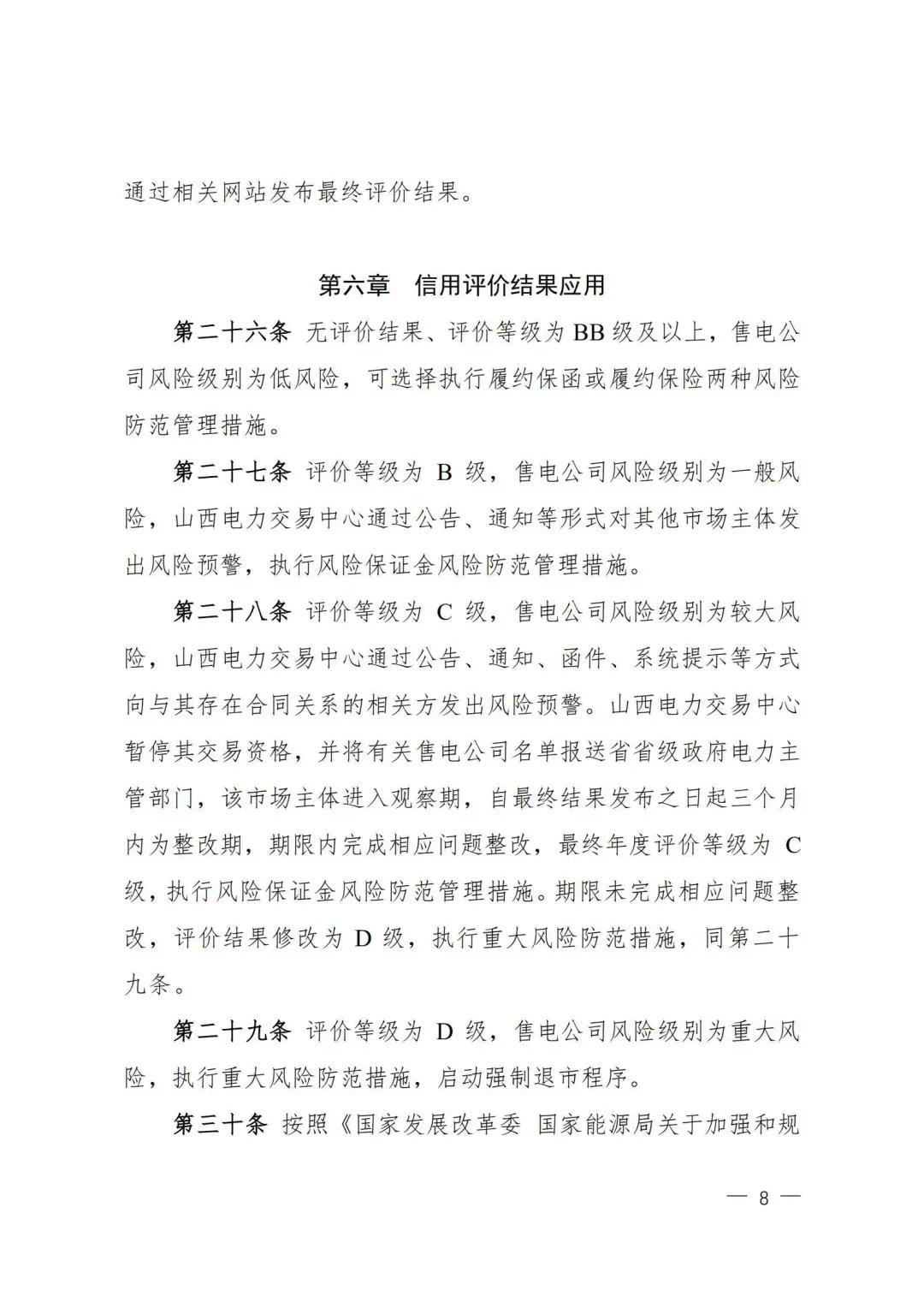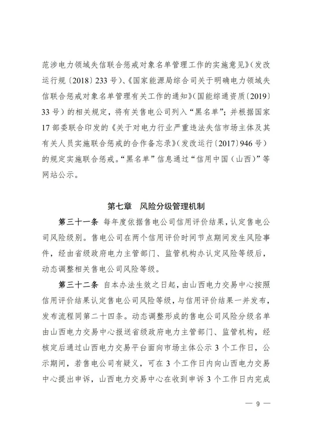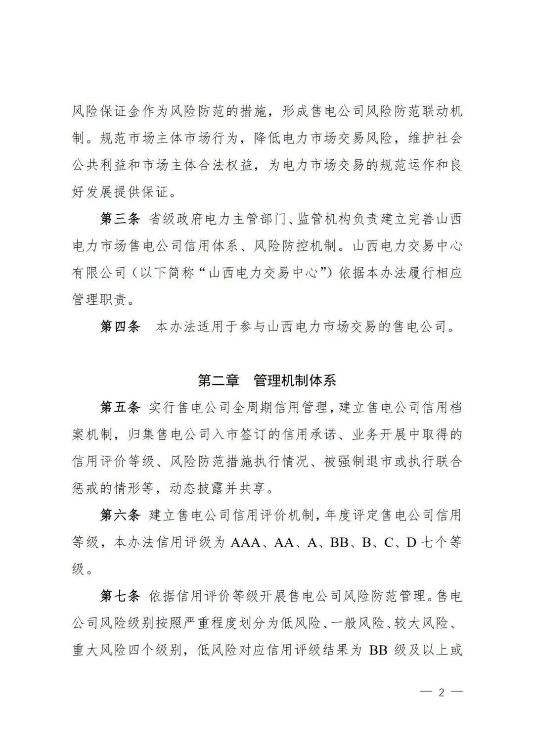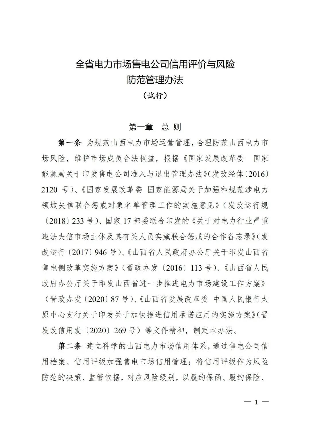 | 山西電力市場售電公司信用評(píng)價(jià)與風(fēng)險(xiǎn)防范管理辦法:依據(jù)風(fēng)險(xiǎn)級(jí)別執(zhí)行履約保函、保險(xiǎn)或風(fēng)險(xiǎn)保證金措施 |